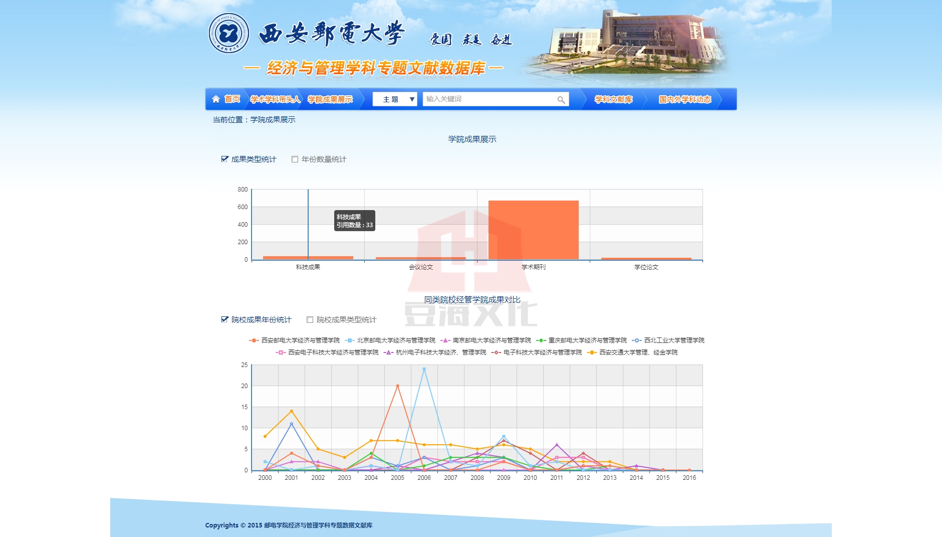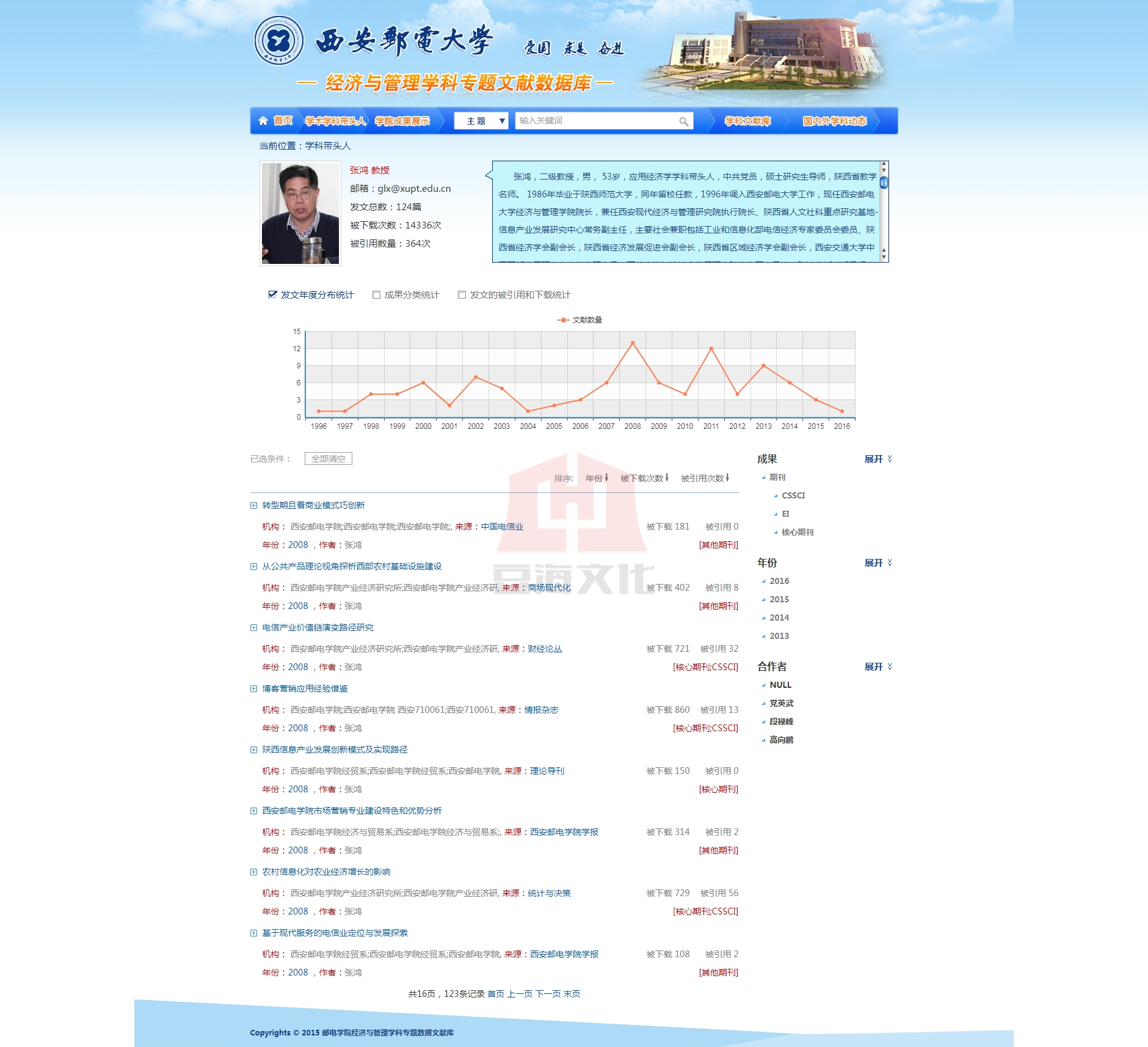 經濟與管理專題特色文獻數據庫旨在建立具有西安郵電大學特色的、規範的、可持續發展的經濟與管理學科所涉及專業的文獻保障體係。該數據庫主要從學院曆史沿革、學術熱點、專家學者、專業學科文獻、同(tong)類(lei)院(yuan)校(xiao)學(xue)科(ke)概(gai)況(kuang)五(wu)大(da)塊(kuai)進(jin)行(xing)特(te)色(se)數(shu)據(ju)庫(ku)整(zheng)體(ti)框(kuang)架(jia)的(de)搭(da)建(jian)。通(tong)過(guo)對(dui)經(jing)濟(ji)與(yu)管(guan)理(li)學(xue)院(yuan)曆(li)史(shi)發(fa)展(zhan)曆(li)程(cheng)的(de)研(yan)究(jiu),每(mei)個(ge)發(fa)展(zhan)階(jie)段(duan)學(xue)術(shu)熱(re)點(dian)的(de)整(zheng)理(li),各(ge)個(ge)階(jie)段(duan)學(xue)院(yuan)人(ren)物(wu)(包括學院領導和科研學者)的統計分析來判斷經濟與管理學院的發展軌跡,呈現學院的發展脈絡。