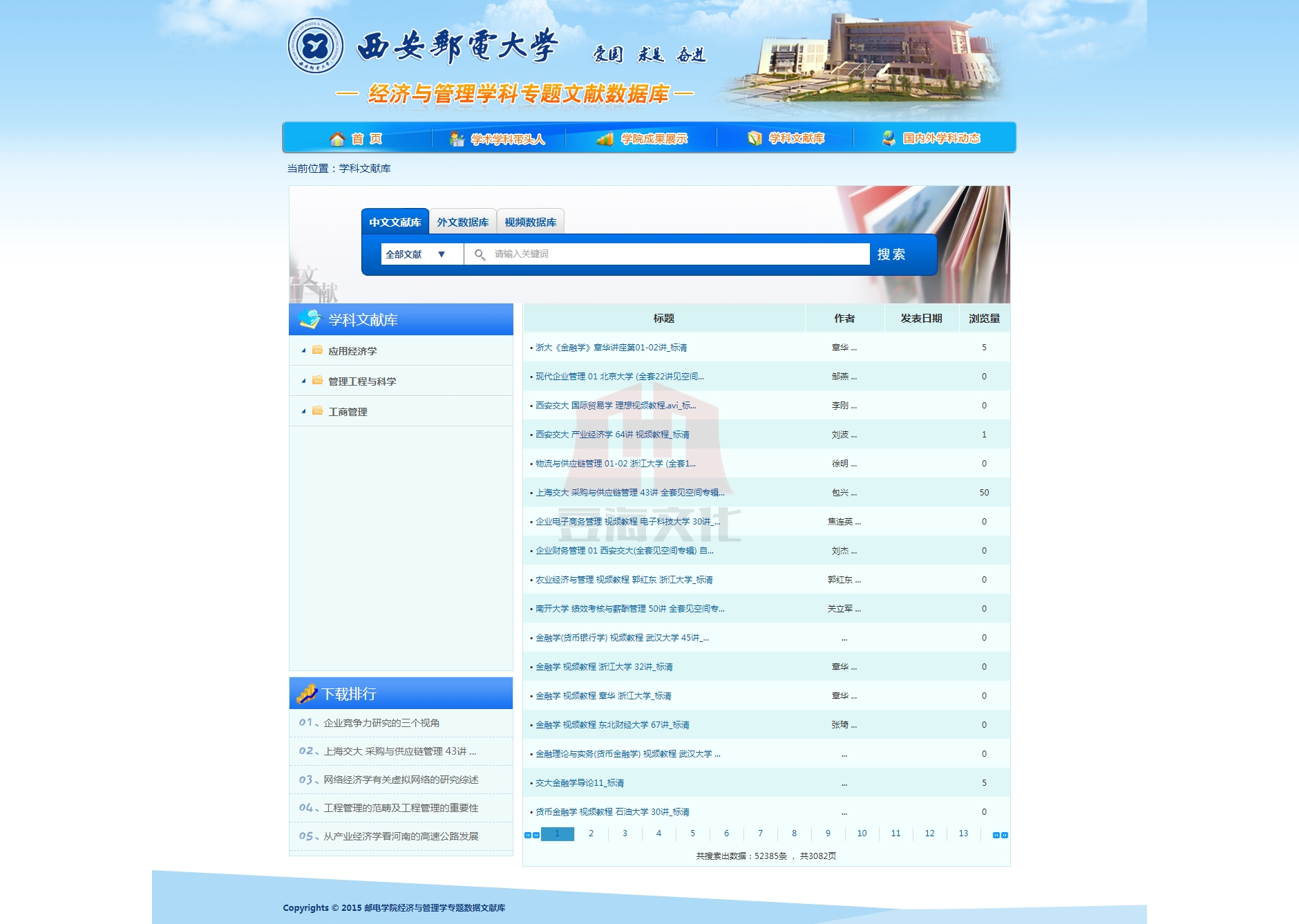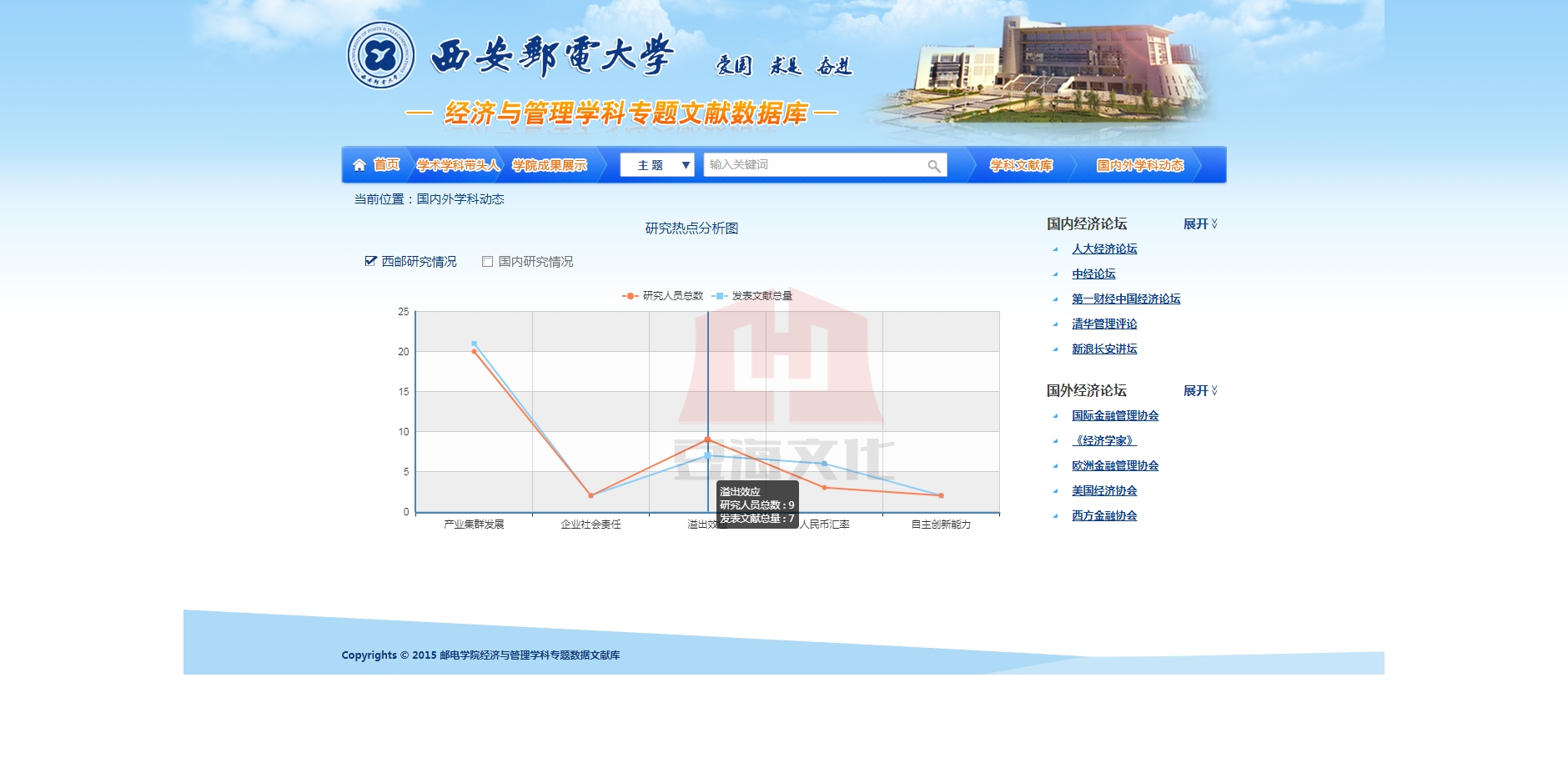 經濟與管理專題特色文獻數據庫旨在建立具有西安郵電大學特色的、規範的、可持續發展的經濟與管理學科所涉及專業的文獻保障體係。該數據庫主要從學院曆史沿革、學術熱點、專家學者、專業學科文獻、同(tong)類(lei)院(yuan)校(xiao)學(xue)科(ke)概(gai)況(kuang)五(wu)大(da)塊(kuai)進(jin)行(xing)特(te)色(se)數(shu)據(ju)庫(ku)整(zheng)體(ti)框(kuang)架(jia)的(de)搭(da)建(jian)。通(tong)過(guo)對(dui)經(jing)濟(ji)與(yu)管(guan)理(li)學(xue)院(yuan)曆(li)史(shi)發(fa)展(zhan)曆(li)程(cheng)的(de)研(yan)究(jiu),每(mei)個(ge)發(fa)展(zhan)階(jie)段(duan)學(xue)術(shu)熱(re)點(dian)的(de)整(zheng)理(li),各(ge)個(ge)階(jie)段(duan)學(xue)院(yuan)人(ren)物(wu)(包括學院領導和科研學者)的統計分析來判斷經濟與管理學院的發展軌跡,呈現學院的發展脈絡。