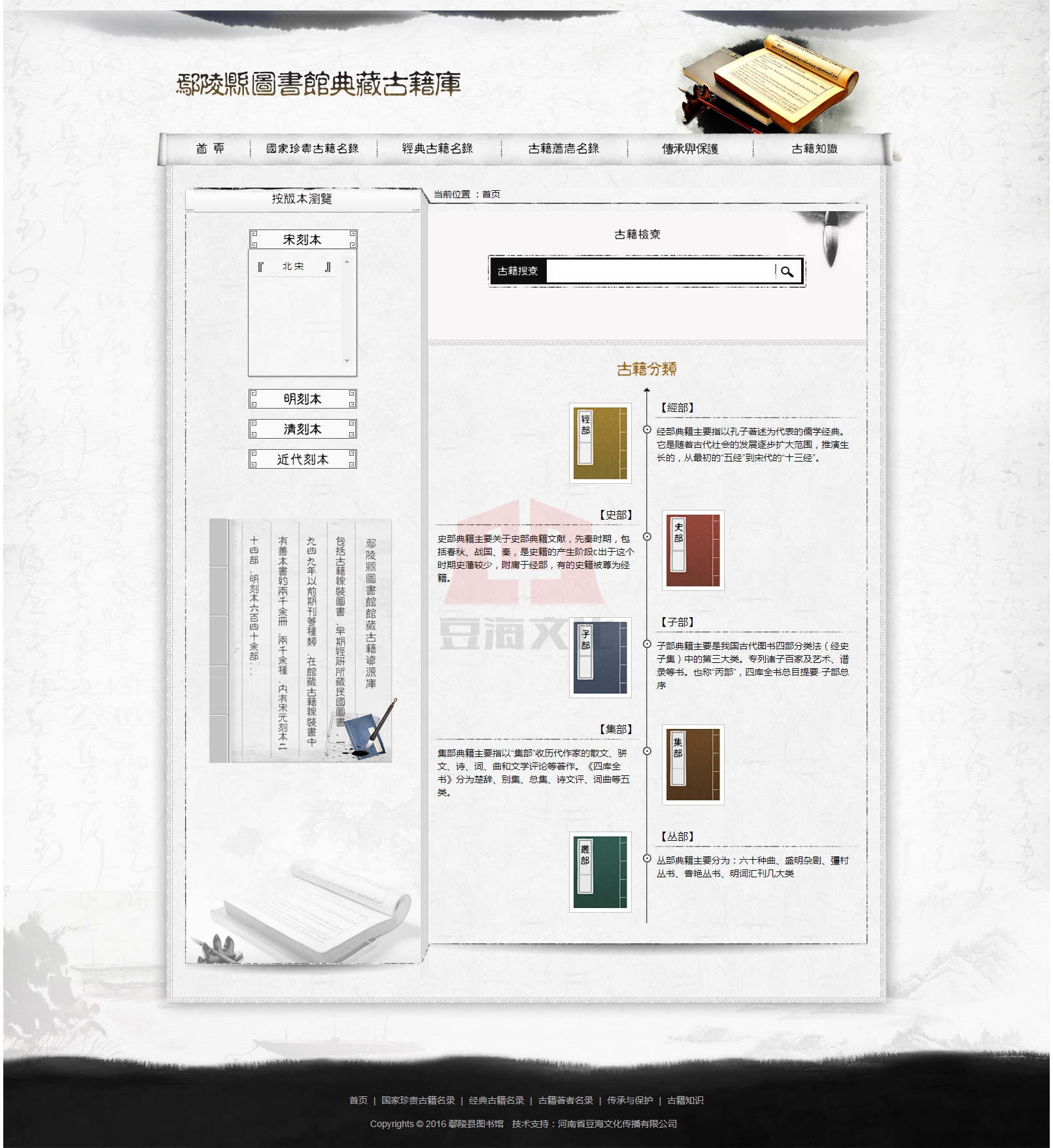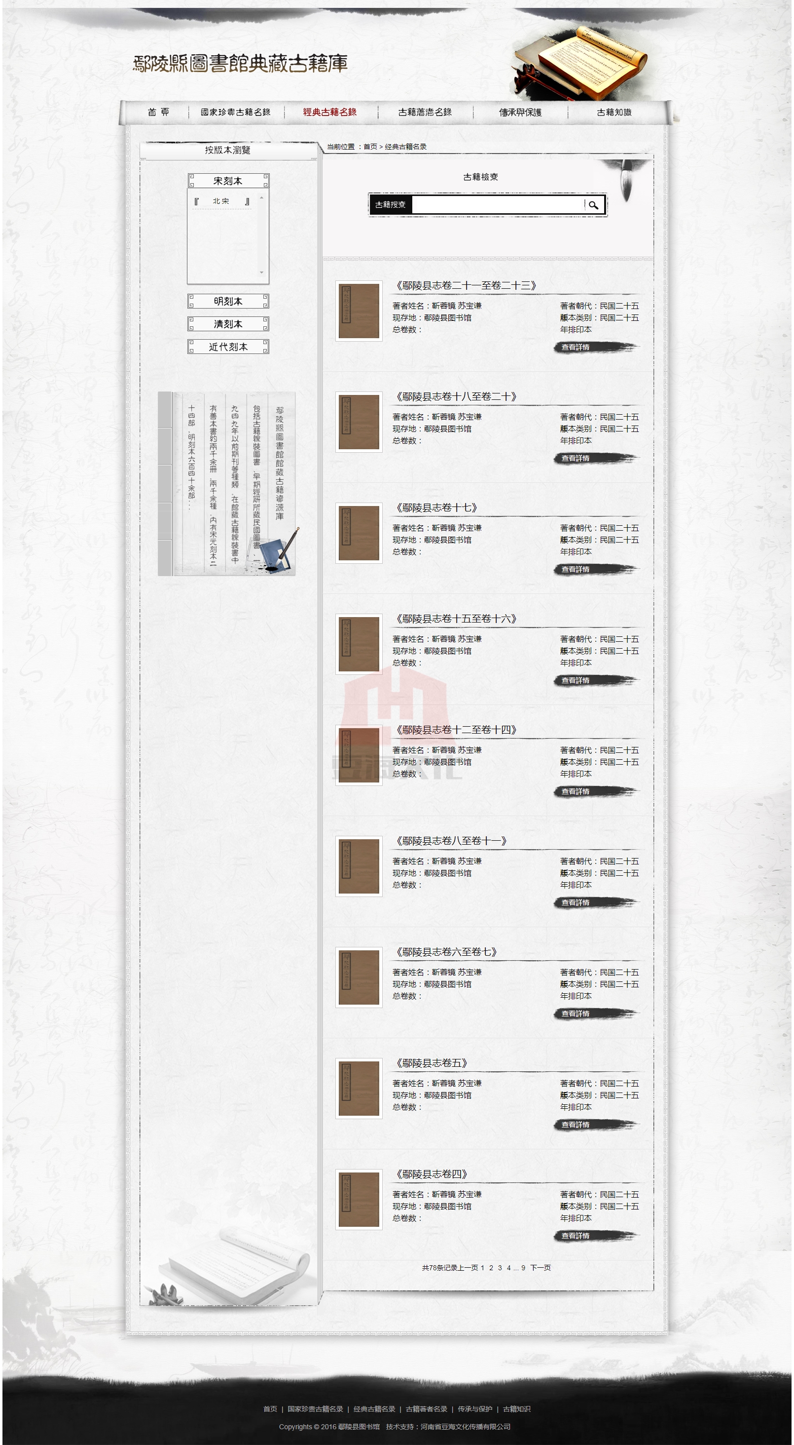古籍文獻數據庫擬包含六大欄目:縣館傳承與發展、國家級珍貴古籍、省級珍貴古籍、經典古籍、古籍作者庫、古籍知識。